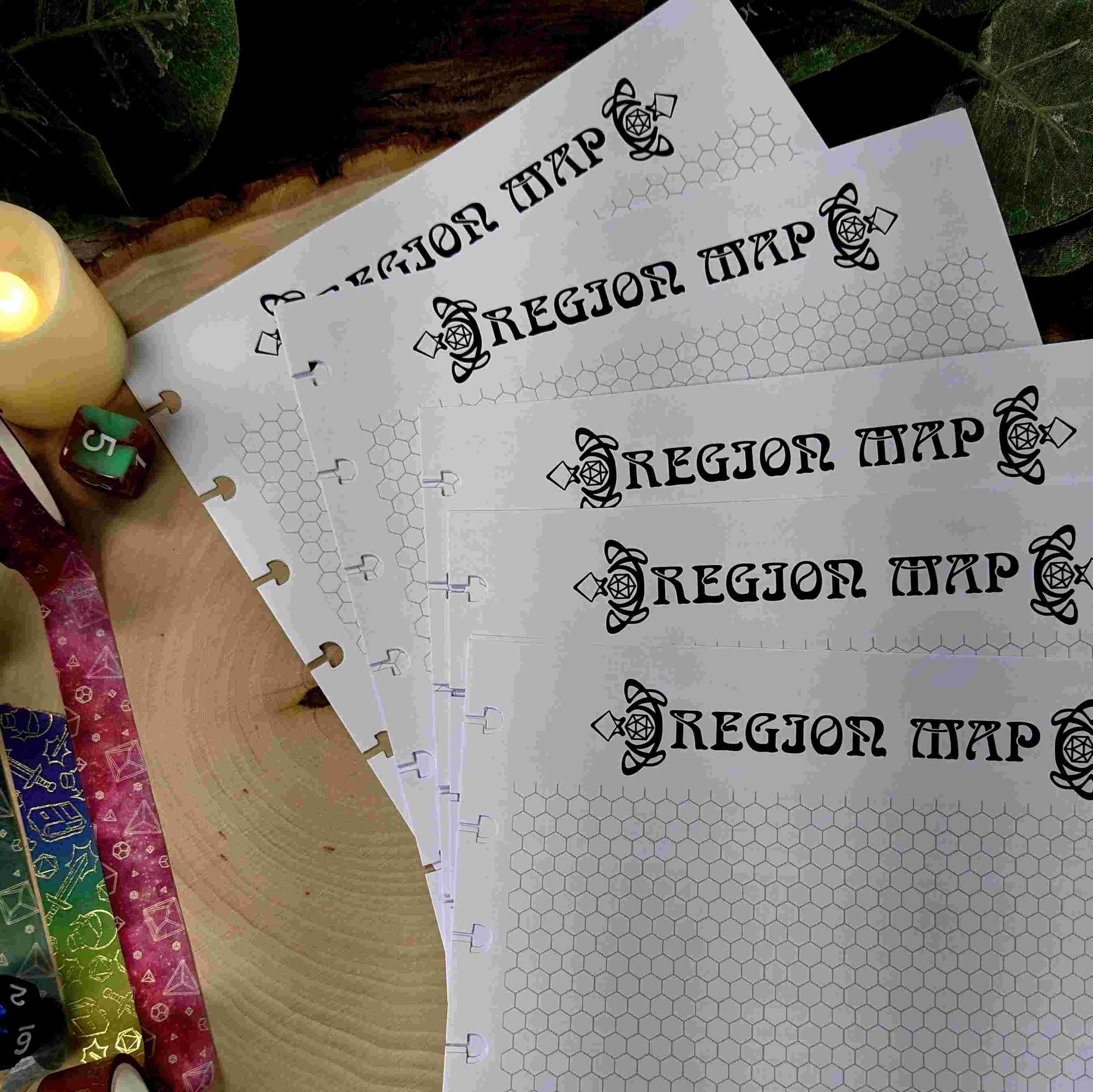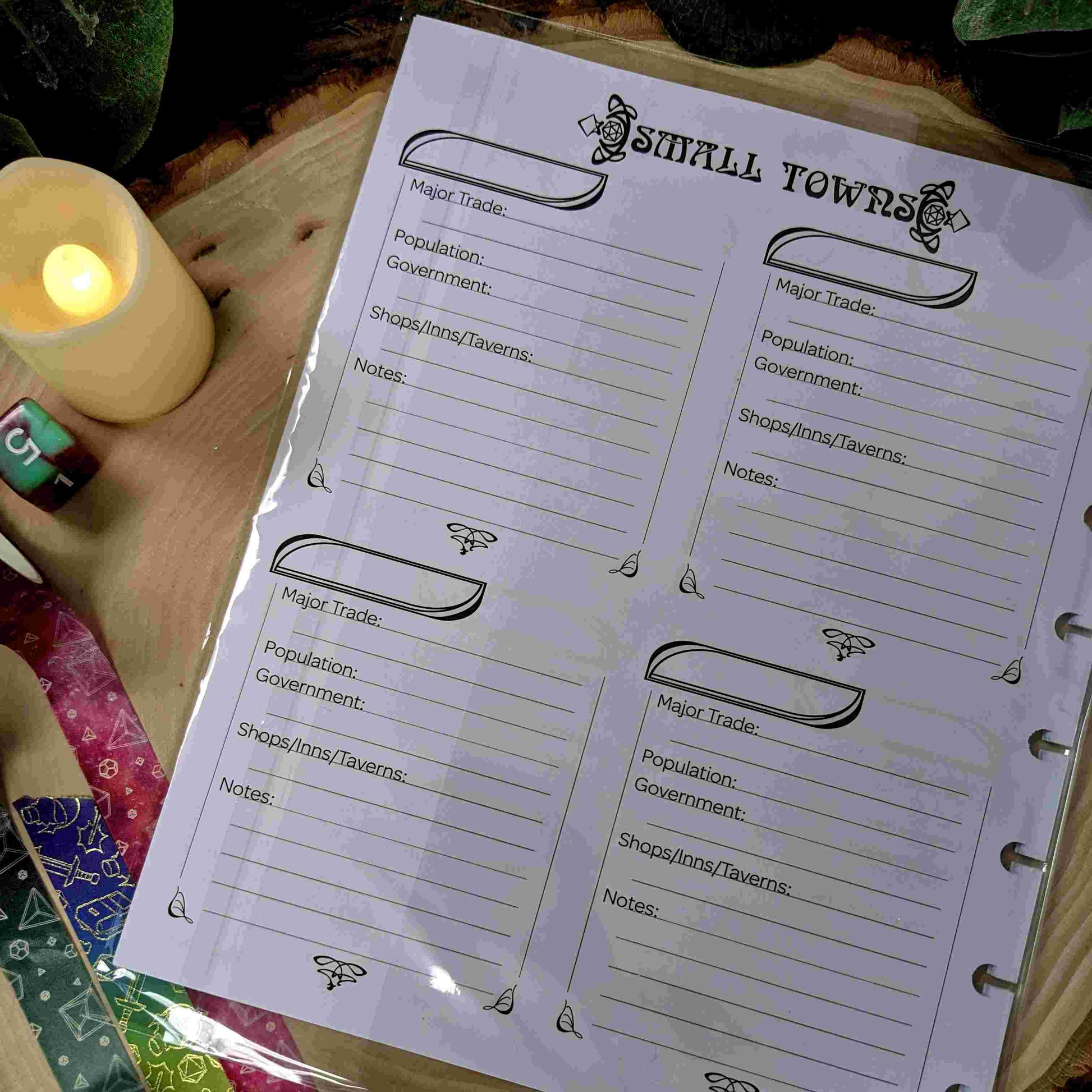 Pick up more pages for your dungeon master's or game master's notebook! All sheets in this listing are 8.5 x 7 inches, are pre-punched, and work with an 8-disc system. These are wrapped in a plastic sleeve for shipping.