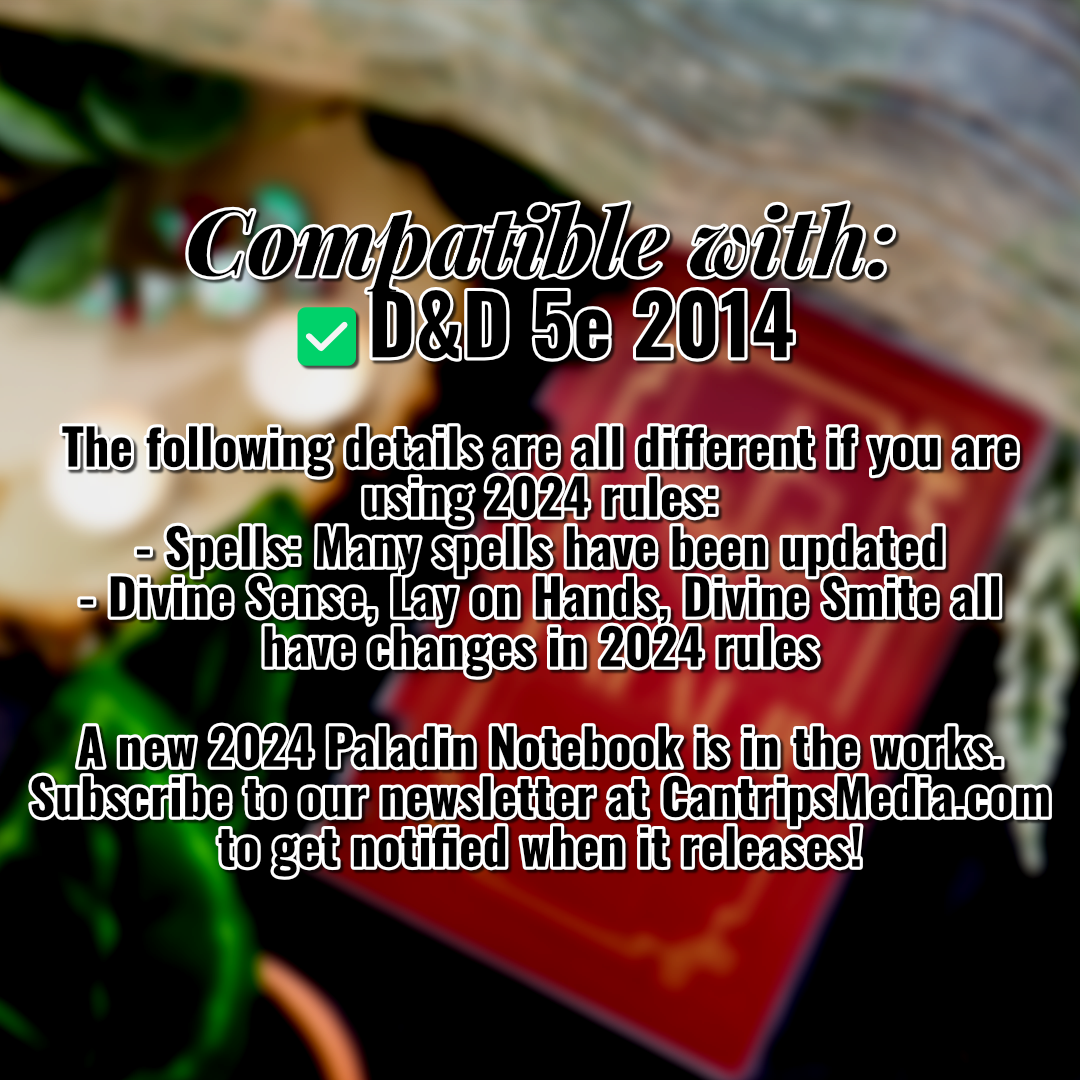 This journal is made with paladins in mind, so we included the FULL PALADIN SPELL LIST (as noted in the Player's Handbook)! We've taken the trouble of copying all your spells into your notebook for you so that you can get focus on smiting all those fiends. Don't worry if you choose to add spells from other D&D sourcebooks: we added a few extra spell pages for you to write them in. We also have page packs that can be easily added to this journal in our shop! These are the 2014 spell list! I'm working on an updated notebook for 2024! Coming soon!